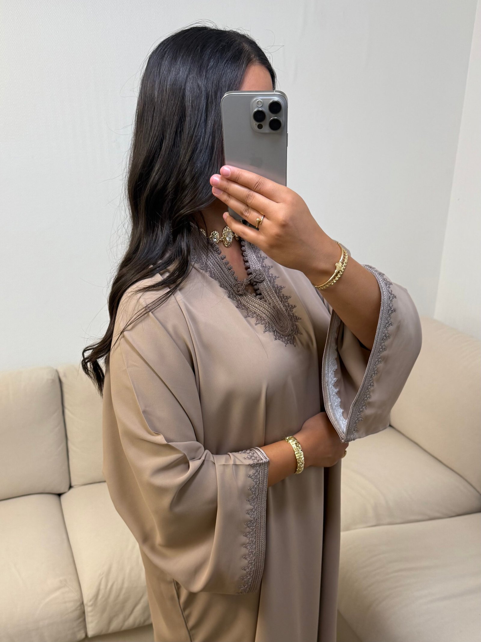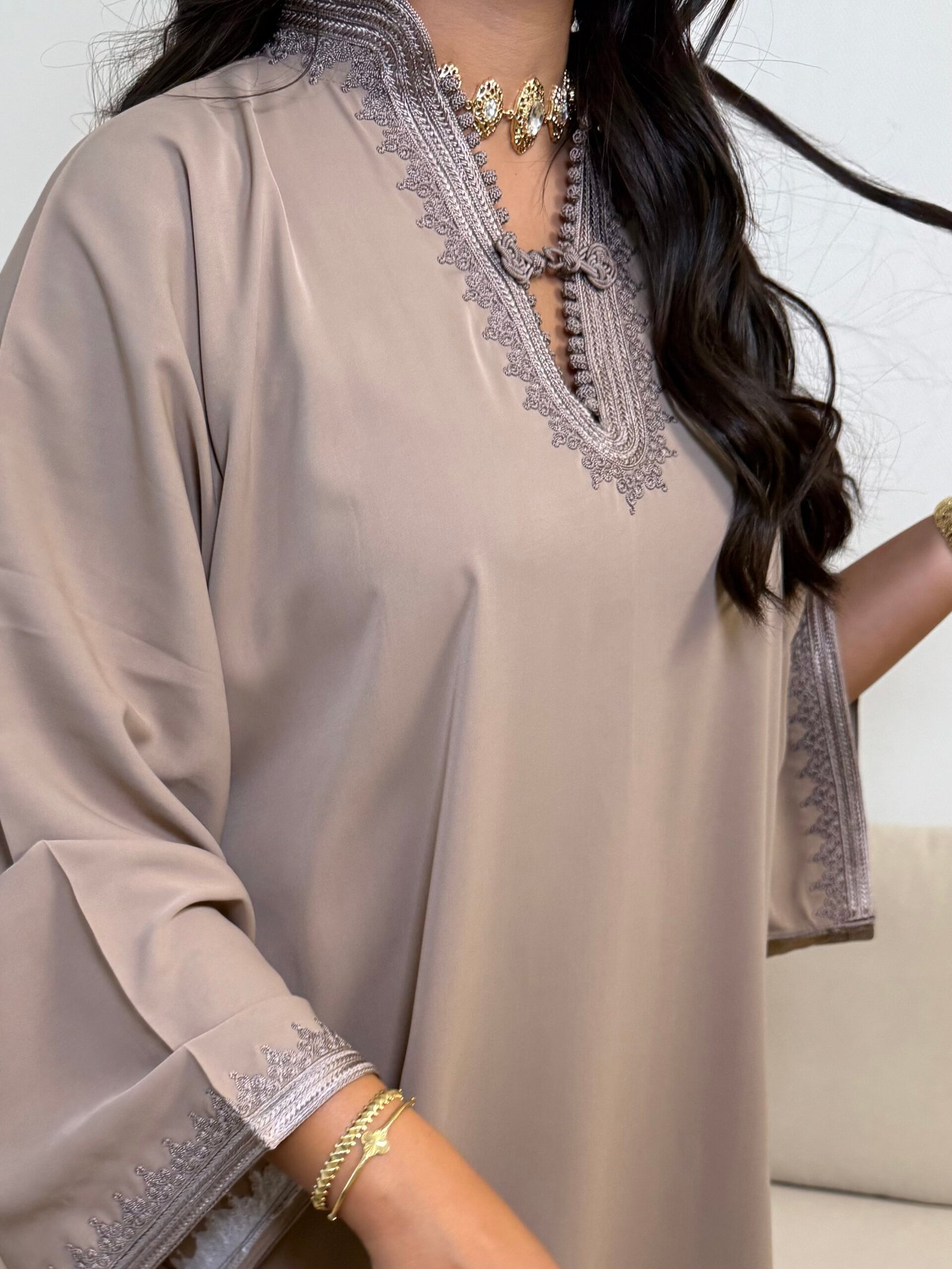Confectionnée avec précision dans nos ateliers, l’Abaya Caftan Tasnim en taupe séduit par sa douceur subtile et ses broderies raffinées. Sa teinte neutre et apaisante incarne un charme minimaliste, offrant une élégance discrète et polyvalente. Sa fluidité et sa coupe épurée assurent confort et distinction, parfaite pour s’adapter à toutes vos occasions.